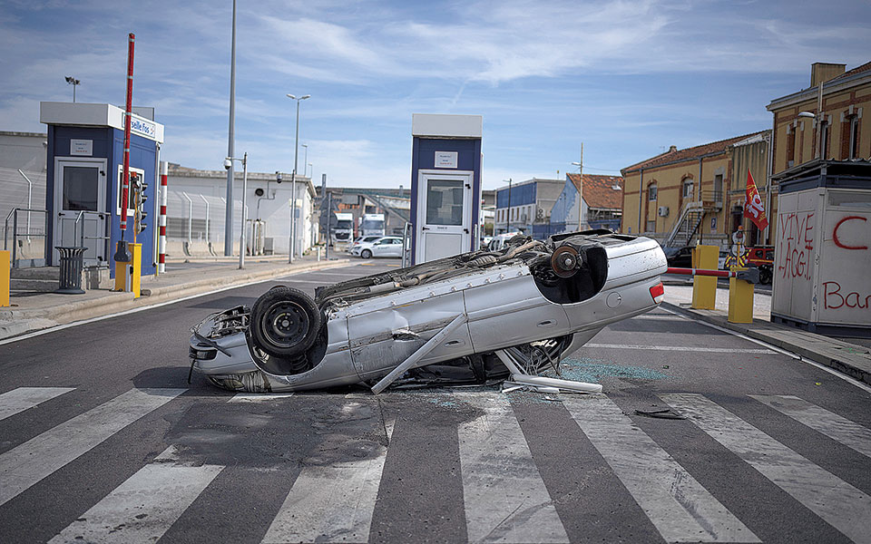 Αναποδογυρισμένο αυτοκίνητο κλείνει τον δρόμο σε λιμάνι της Μασσαλίας, στη νότια Γαλλία. Φωτ. A.P. Photo / Daniel Cole.
