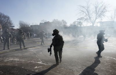 Μέλη της εθνοφρουράς με στρατιωτικές στολές, εφοδιασμένα με ρόπαλα και ασπίδες αντιμετώπισης ταραχών, αναπτύχθηκαν χθες μπροστά σε ομοσπονδιακό κέντρο κράτησης της πόλης. Απέναντί τους, διαδηλωτές φώναζαν «γουρούνια, γυρίστε σπίτια σας!».