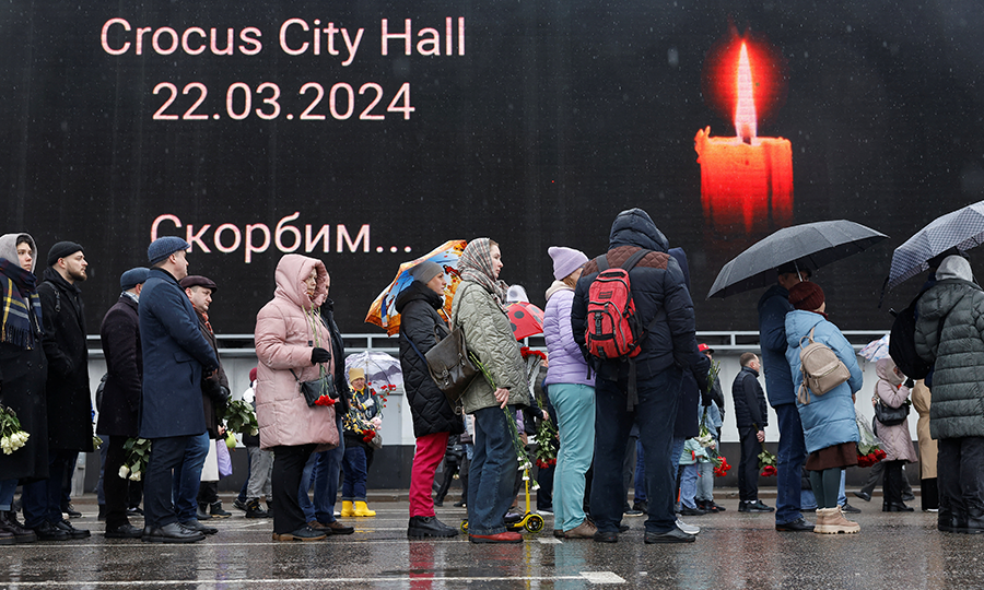 «Ολόκληρη η χώρα πενθεί μαζί με αυτούς που έχασαν αγαπημένα τους πρόσωπα σε αυτήν την απάνθρωπη τραγωδία», μετέδωσε σήμερα το πρωί το ρωσικό δημόσιο τηλεοπτικό δίκτυο Rossia 24. Το δίκτυο πρόβαλε πλάνα από τεράστιο ψηφιακό πάνελ που έχει τοποθετηθεί σε τοίχο της αίθουσας συναυλιών που δέχθηκε την επίθεση, το οποίο δείχνει ένα κερί σε μαύρο φόντο και στο οποίο αναγράφεται: «Crocus City Hall. 22/03/2024. Πενθούμε…».