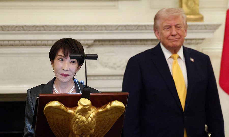 Η Σαναέ Τακαΐτσι φάνηκε αιφνιδιασμένη από τη δήλωση, ανοίγοντας τα μάτια της και μετακινούμενη αμήχανα στην καρέκλα της, καθώς ο Τραμπ —καθισμένος δίπλα της στο Οβάλ Γραφείο— αναφερόταν στο γεγονός που οδήγησε τις Ηνωμένες Πολιτείες στον Β’ Παγκόσμιο Πόλεμο.