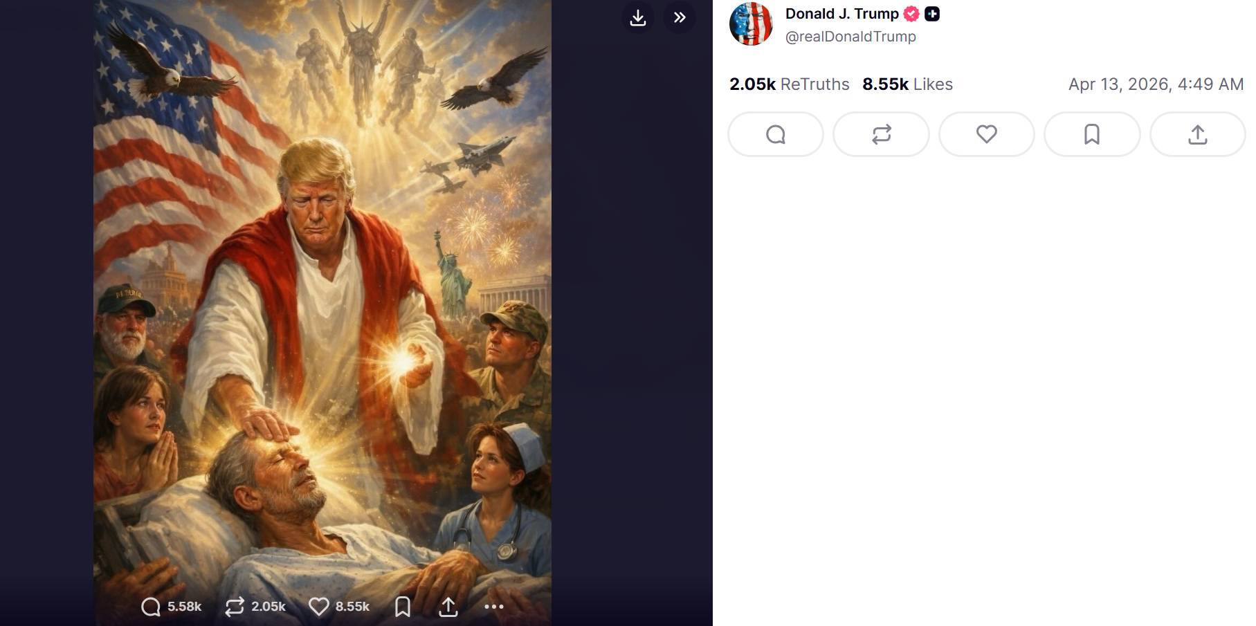 Ο Ντόναλντ Τραμπ ανέβασε στην πλατφόρμα Truth Social εικόνα δημιουργημένη από κάποιο εργαλείο τεχνητής νοημοσύνης στην οποία ο ίδιος παρουσιάζεται, με λευκή και κόκκινη τήβεννο, να βάζει το χέρι στο μέτωπο αρρώστου, κλινήρη στο νοσοκομείο, πλαισιωμένος από ανθρώπους που προσεύχονται ή κάτι προσμένουν, και στο φόντο αμερικανική σημαία, το Αγαλμα της Ελευθερίας, καταδιωκτικά, αετούς και άλλες μορφές.