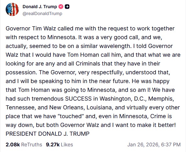 Ο πρόεδρος των ΗΠΑ Ντόναλντ Τραμπ δήλωσε ότι είχε «καλή συνομιλία» με τον κυβερνήτη της Μινεσότα Τιμ Γουόλς και ότι οι δύο πλευρές θέλουν να συνεργαστούν για τη βελτίωση της κατάστασης στην Πολιτεία, όπου δύο Αμερικανοί πολίτες δολοφονήθηκαν από πράκτορες μετανάστευσης.
