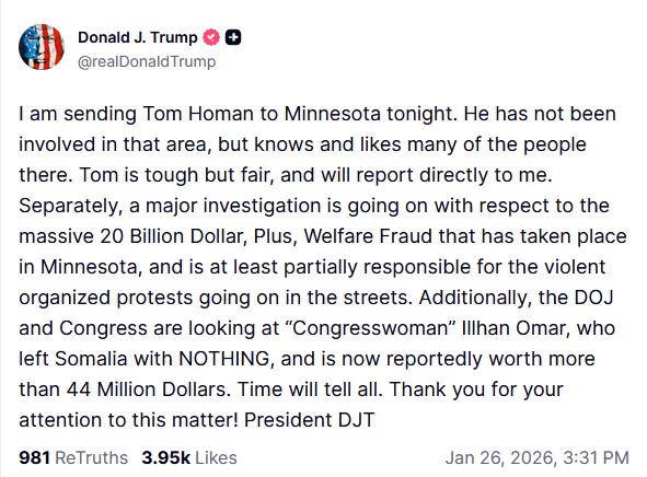«Στέλνω τον Τομ Χόμαν στη Μινεσότα απόψε. Δεν έχει εμπλακεί μέχρι τώρα σε αυτήν την περιοχή, αλλά γνωρίζει και εκτιμά πολλούς από τους ανθρώπους εκεί. Ο Τομ είναι σκληρός αλλά δίκαιος και θα αναφέρεται απευθείας σε μένα. Παράλληλα, βρίσκεται σε εξέλιξη μια μεγάλη έρευνα σχετικά με τη μαζική απάτη στο σύστημα κοινωνικής πρόνοιας, ύψους άνω των 20 δισεκατομμυρίων δολαρίων, που έχει λάβει χώρα στη Μινεσότα και είναι, τουλάχιστον εν μέρει, υπεύθυνη για τις βίαιες οργανωμένες διαμαρτυρίες που εξελίσσονται στους δρόμους. Επιπλέον, το υπουργείο Δικαιοσύνης και το Κογκρέσο εξετάζουν την υπόθεση της “βουλευτή” Ιλχαν Ομαρ, η οποία έφυγε από τη Σομαλία χωρίς ΤΙΠΟΤΑ και πλέον, σύμφωνα με πληροφορίες, η περιουσία της ξεπερνά τα 44 εκατομμύρια δολάρια. Ο χρόνος θα δείξει τα πάντα. Ευχαριστώ για την προσοχή σας στο ζήτημα αυτό.