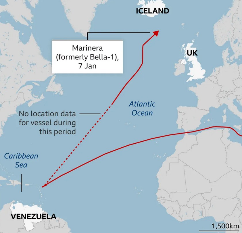 Σύμφωνα με το BBC Verify, μετά την πρόσφατη κατάσχεση άλλου δεξαμενόπλοιου, του «Skipper», έχουν εντοπιστεί τουλάχιστον 19 δεξαμενόπλοια υπό αμερικανικές κυρώσεις που άλλαξαν νηολόγιο προς τη Ρωσία, μεταξύ αυτών και το «Marinera».