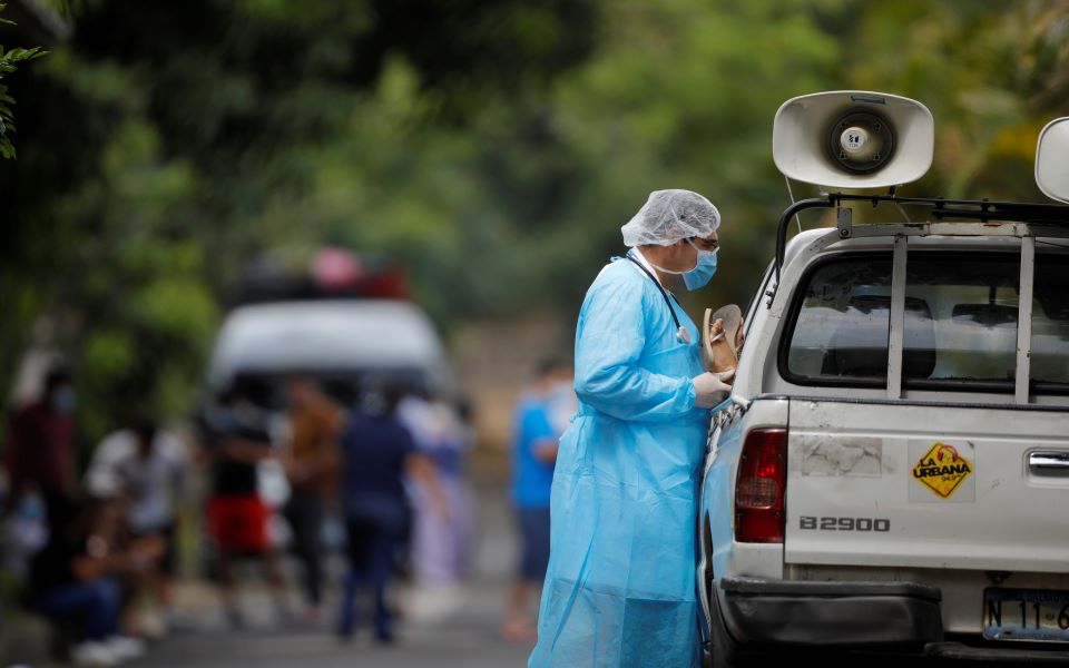 Γιατρός στο Ελ Σαλβαδόρ, φορώντας προστατευτική στολή, παρέχει τις υπηρεσίες του σε περιοχή που τέθηκε σε καραντίνα λόγω του κορωνοϊού.