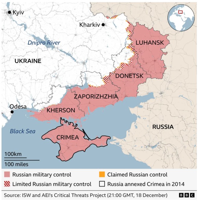 Οι ρωσικές δυνάμεις κατέχουν σχεδόν ολόκληρο το Λουγκάνσκ, αλλά μόλις λίγο πάνω από το 75% της περιφέρειας του Ντονέτσκ. Ο Πούτιν απαιτεί το σύνολο της περιοχής, συμπεριλαμβανομένων των πόλεων Σλοβιάνσκ και Κραματόρσκ.