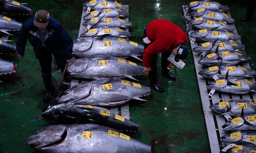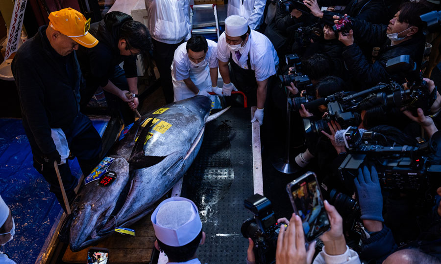 Ενας τεράστιος τόνος βάρους 243 κιλών πωλήθηκε στην τιμή – ρεκόρ των 510 εκατομμυρίων γιεν (3,2 εκατ. δολάρια) στην πρώτη δημοπρασία του 2026 στην ιχθυαγορά Τογιόσου του Τόκιο.