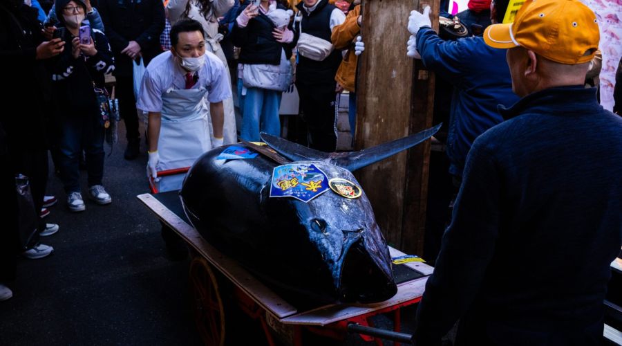 Ενας τεράστιος τόνος βάρους 243 κιλών πωλήθηκε στην τιμή – ρεκόρ των 510 εκατομμυρίων γιεν (3,2 εκατ. δολάρια) στην πρώτη δημοπρασία του 2026 στην ιχθυαγορά Τογιόσου του Τόκιο.