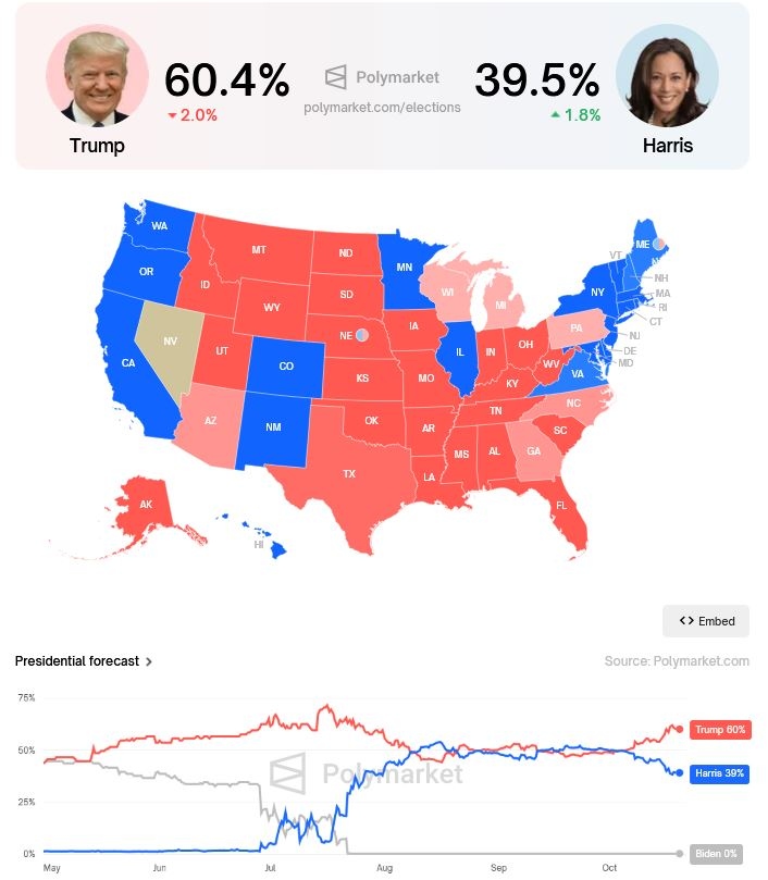 Οι παίκτες έδιναν στον Τραμπ 62% πιθανότητες νίκης την Πέμπτη (17/10), ενώ οι πιθανότητες της Χάρις ήταν 38%. Οι υποψήφιοι ήταν ισόπαλοι στις αρχές Οκτωβρίου.