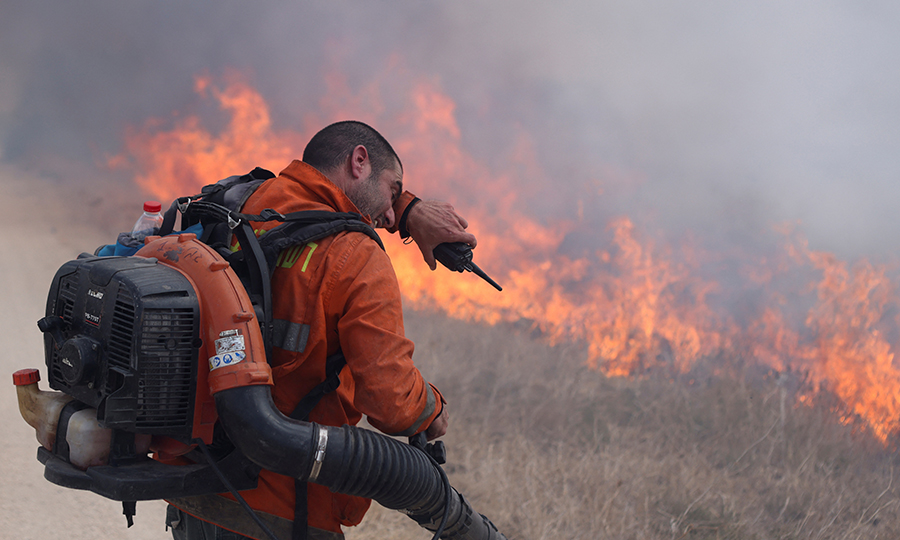 Eνας άνδρας προσπαθεί να σβήσει φωτιά που ξέσπασε έπειτα από επίθεση με ρουκέτες από τον Λίβανο, στα κατεχόμενα από το Ισραήλ, Υψίπεδα του Γκολάν – Φωτ.: Reuters