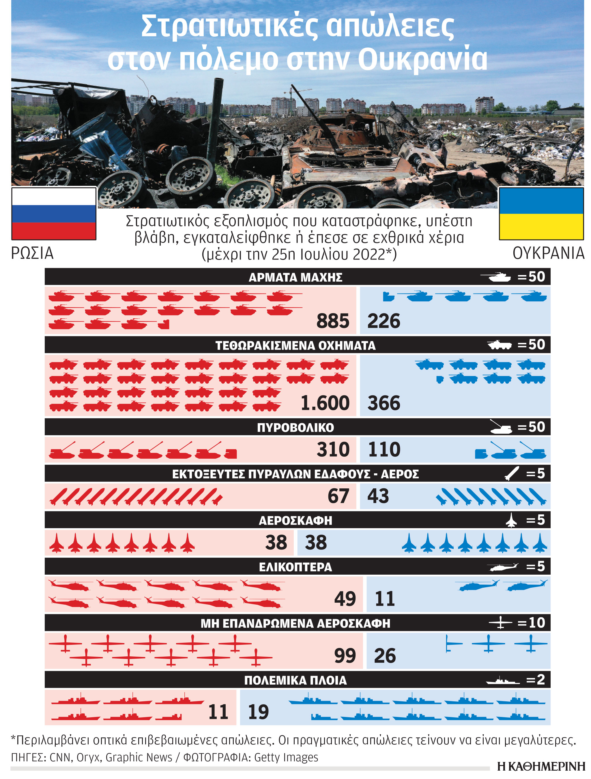 Η συνεννόηση γύρω από τα σιτηρά δεν συμβαδίζει με κάποιου είδους ύφεση των εχθροπραξιών από την πλευρά της Ρωσίας. Χθες το πρωί, μπαράζ ρωσικών πυραύλων που εκτοξεύθηκαν από θαλάσσης και αέρος έπληξαν παραθαλάσσιους στόχους κοντά στην πόλη Μικολάιβ και στην Οδησσό. Ο Ρώσος διοικητής της Χερσώνας υποστήριξε ότι η κατάληψη των πόλεων αυτών από τις ρωσικές δυνάμεις είναι ζήτημα χρόνου. Παράλληλα, οι ρωσικοί βομβαρδισμοί σε όλο το μήκος του μετώπου στο Ντονέτσκ και στις πόλεις Μπαχμούτ, Αβντίκα και Τορέτσκ συνεχίζονται. Ο κυβερνήτης της ουκρανικής επαρχίας Ντονέτσκ, που βρίσκεται κατά 50% υπό ρωσικό έλεγχο, Πέτρο Κιριλένκο, κατηγόρησε τις ρωσικές δυνάμεις ότι χρησιμοποιούν βόμβες διασποράς και επανέλαβε την έκκλησή του για απομάκρυνση των αμάχων. «Δεν υπάρχει πλέον ούτε ένα ασφαλές σημείο, τα πάντα βομβαρδίζονται», είπε ο Κιριλένκο σε τηλεοπτικά σχόλια. «Υπάρχουν όμως ακόμη διάδρομοι για την απομάκρυνση του άμαχου πληθυσμού».