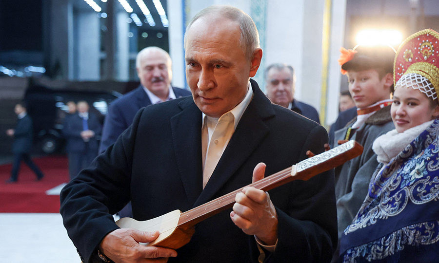 Ο Πούτιν κρατάει ένα έγχορδο κατά την επίσκεψή του στην Κρατική Οικία Ala-Archa στο Μπισκέκ της Κιργιζίας. Sputnik/Alexander Kazakov/via REUTERS