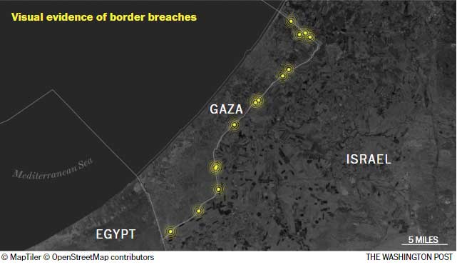 Με βάση τα παραπάνω, η Post εντόπισε 14 ξεχωριστές παραβιάσεις του φράχτη. Συγκρίνοντας το υλικό με χάρτες, δορυφορικές εικόνες και άλλα δεδομένα, οι παραβιάσεις έγιναν από το πέρασμα Erez στον Βορρά έως το Kerem Shalom στο Νότο. Το Ισραήλ δήλωσε ότι υπήρξαν συνολικά περίπου 30 παραβιάσεις.
