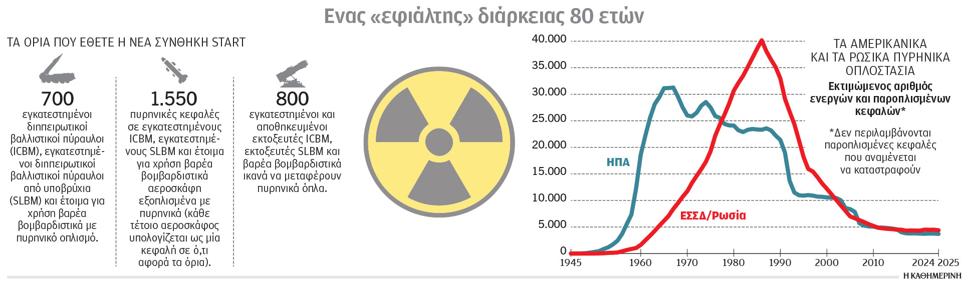 Εάν δεν μεσολαβήσει κάποια ευχάριστη έκπληξη της τελευταίας στιγμής, η ανθρωπότητα θα δρασκελίσει αύριο ένα επικίνδυνο κατώφλι: η συμφωνία New START για τον περιορισμό και τον έλεγχο των στρατηγικών πυρηνικών όπλων, που υπέγραψαν το 2010 στην Πράγα ο Αμερικανός πρόεδρος Μπαράκ Ομπάμα και ο Ρώσος ομόλογός του Ντμίτρι Μεντβέντεφ, θα πάψει να ισχύει. Μαζί με αυτή θα κλείσει μισός αιώνας προσπαθειών για τον έλεγχο των ατομικών όπλων, τις οποίες πυροδότησε η παρ’ ολίγον μοιραία κρίση του 1962 με τους πυραύλους στην Κούβα. Η New START είναι, τη στιγμή που γράφονται αυτές οι γραμμές, η τελευταία αμερικανορωσική συμφωνία που συνεχίζει να επιβιώνει, καθώς όλες οι άλλες είτε δεν επικυρώθηκαν ποτέ είτε ακυρώθηκαν από την Ουάσιγκτον.