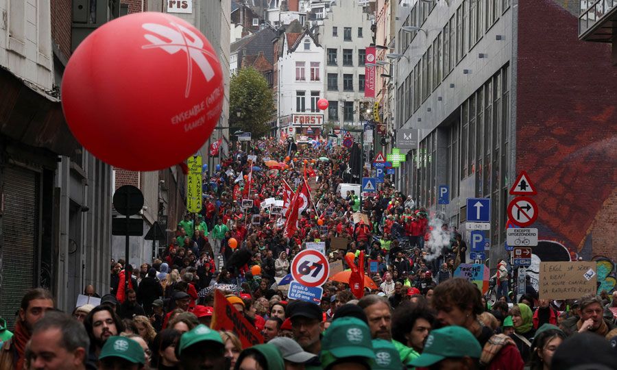 Μεγάλη είναι, ωστόσο, η προσέλευση των διαδηλωτών. Σύμφωνα με τα συνδικάτα, πάνω από 100.000 άνθρωποι διαδηλώνουν από σήμερα το πρωί στους δρόμους των Βρυξελλών (80.000 σύμφωνα με την αστυνομία) κατά των μέτρων λιτότητας της κυβέρνησης συνασπισμού που θέλει να περιορίσει τα επιδόματα ανεργίας σε δύο χρόνια και να εφαρμόσει μια ευρεία μεταρρύθμιση των συντάξεων. Η βελγική κυβέρνηση συνασπισμού δρομολογεί επίσης σημαντικές περικοπές στον κρατικό προϋπολογισμό του 2026, η παρουσίαση του οποίου αναβλήθηκε για την επόμενη εβδομάδα. Τα αιτήματα που προβάλλουν τα τρία μεγάλα συνδικάτα (CSC, FGTB και CGSLB) είναι κυρίως οικονομικά: ποιοτικές θέσεις εργασίας και δίκαιες συντάξεις.