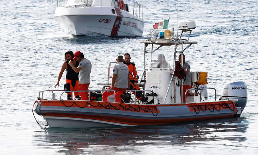Ομάδα διάσωσης ερευνά με σκάφη τη θαλάσσια περιοχή κοντά στην ακτή του Πορτιτσέλο, όπου βυθίστηκε το πολυτελές ιστιοφόρο. Οι δύτες υποχρεώνονται να περιορίσουν τον χρόνο έρευνας στον βυθό στα 12 λεπτά, όπως ορίζουν οι κανονισμοί έρευνας και διάσωσης που ισχύουν στην Ιταλία. Φωτ. REUTERS/Guglielmo Mangiapane