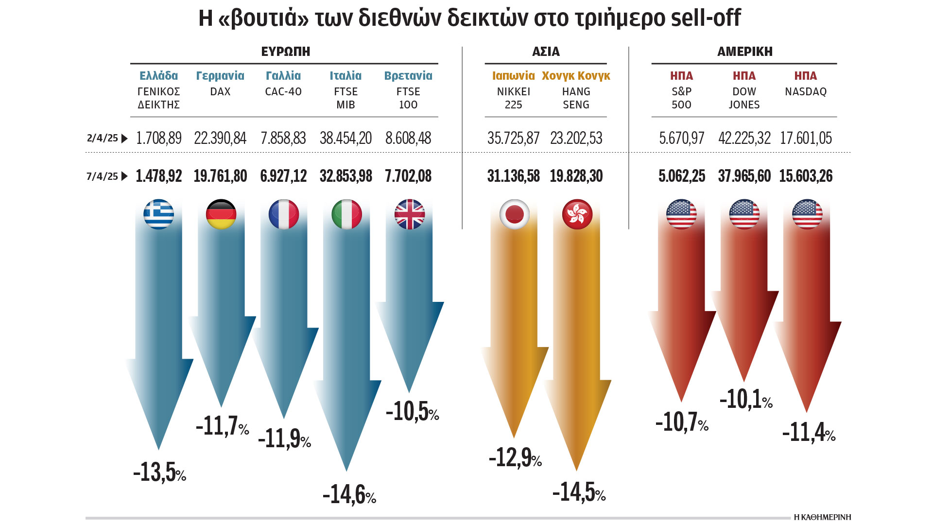 Σημειώνεται πως περίπου 10 τρισ. δολάρια έχουν γίνει καπνός από την αξία των διεθνών μετοχών μέσα σε τρεις ημέρες, ενώ η πτώση σε βασικούς διεθνείς δείκτες ξεπερνά ακόμη και το 15% το ίδιο διάστημα.