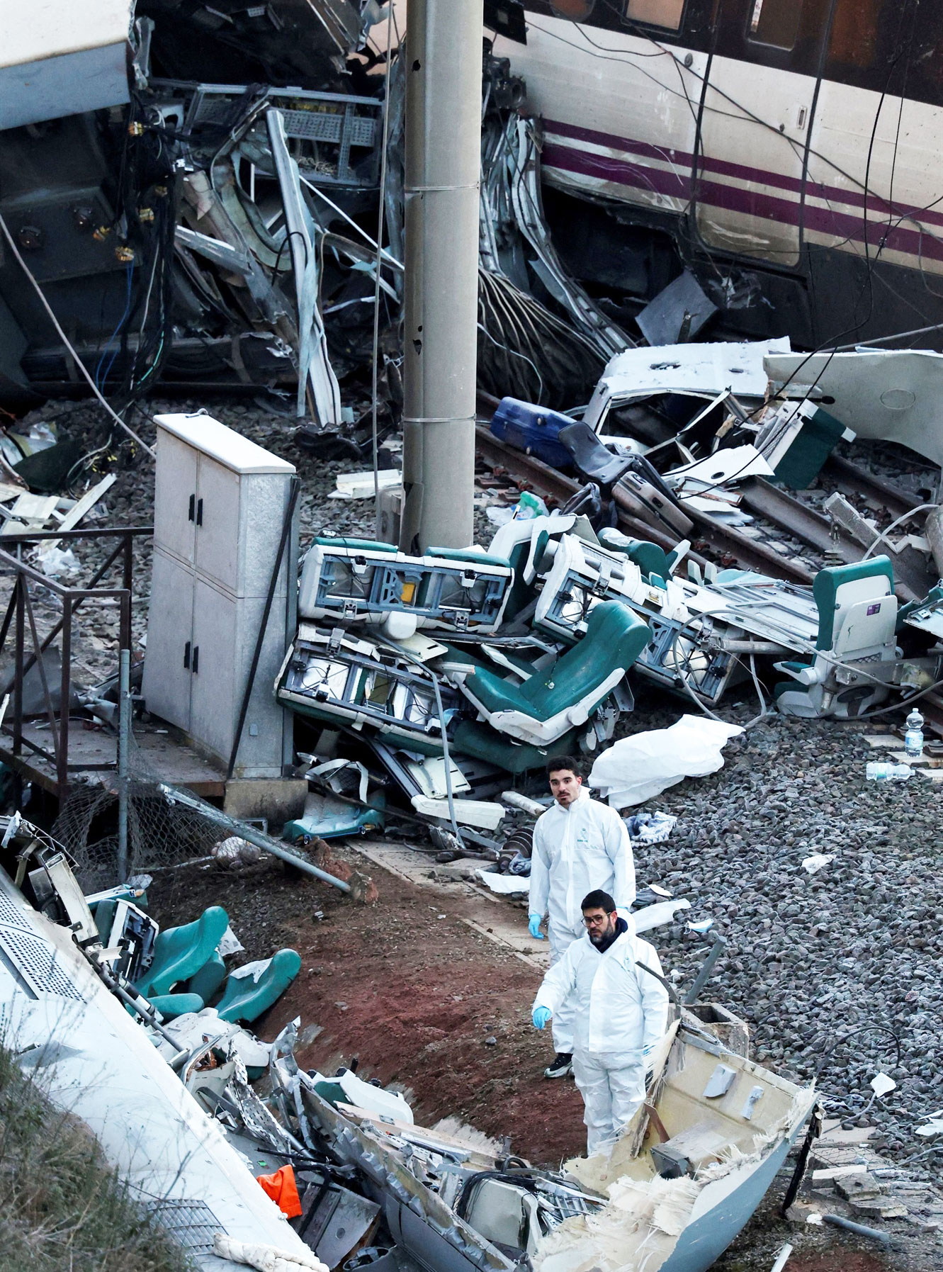 Μέλη των ισπανικών υπηρεσιών εργάζονται δίπλα στα συντρίμμια ενός από τα τρένα που συγκρούστηκαν, αναζητώντας στοιχεία. Τα σωστικά συνεργεία σταμάτησαν τις προσπάθειες εντοπισμού επιζώντων. [REUTERS / Susana Vera]