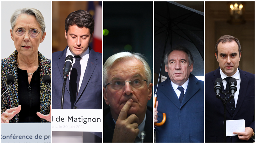 Από τις αρχές του 2024, η Γαλλία έχει αλλάξει πέντε πρωθυπουργούς και τώρα πάει για τον έκτο. Από αριστερά προς τα δεξιά: Ε. Μπορν, Γκ. Ατάλ, Μ. Μπαρνιέ, Φ. Μπαϊρού, Σ. Λεκορνί (AP Photos)