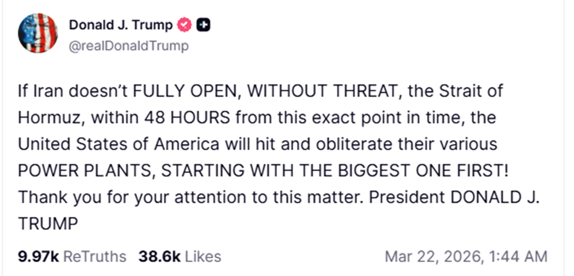 Αν ληφθεί υπόψη η ώρα που δημοσίευσε το μήνυμα αυτό μέσω Truth Social, προχθές Σάββατο, το τελεσίγραφό του θα εκπνεύσει στις 01:44 (ώρα Κύπρου), το απόγευμα της Δευτέρας ώρα Ουάσιγκτον, νωρίς το πρωί της Τρίτης ώρα Τεχεράνης.