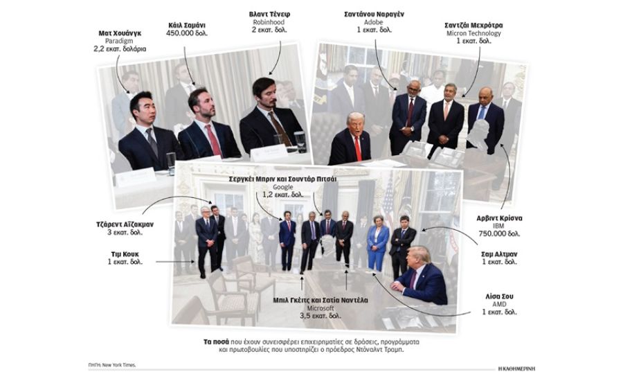 Μετά την επάνοδο του Ντόναλντ Τραμπ στον Λευκό Οίκο τον Ιανουάριο, ο ίδιος και οι σύμμαχοί του συγκέντρωσαν σχεδόν 2 δισ. δολάρια για τις πολιτικές εκστρατείες και πρωτοβουλίες του. Το ποσόν αυτό ξεπερνάει τα κεφάλαια που δαπανήθηκαν για την προεκλογική εκστρατεία του το 2024. Αυτά τα εντυπωσιακά έσοδα αποκαλύπτουν πρωτοφανή για τα αμερικανικά πολιτικά δεδομένα συναλλαγή. Περισσότερα από 500 εκατ. δολάρια προήλθαν από 346 δωρητές, οι οποίοι κατέθεσαν τουλάχιστον 250.000 δολάρια ο καθένας. Σχεδόν οι μισοί από αυτούς σχετίζονται με βιομηχανίες οι οποίες επωφελήθηκαν από πρωτοβουλίες ή δηλώσεις του Τραμπ, του Λευκού Οίκου ή των ομοσπονδιακών υπηρεσιών. Οι δωρεές αυτές δεν ωφέλησαν ευθέως τον Τραμπ, όπως γίνεται με τις τοποθετήσεις της οικογένειάς του σε κρυπτονομίσματα.