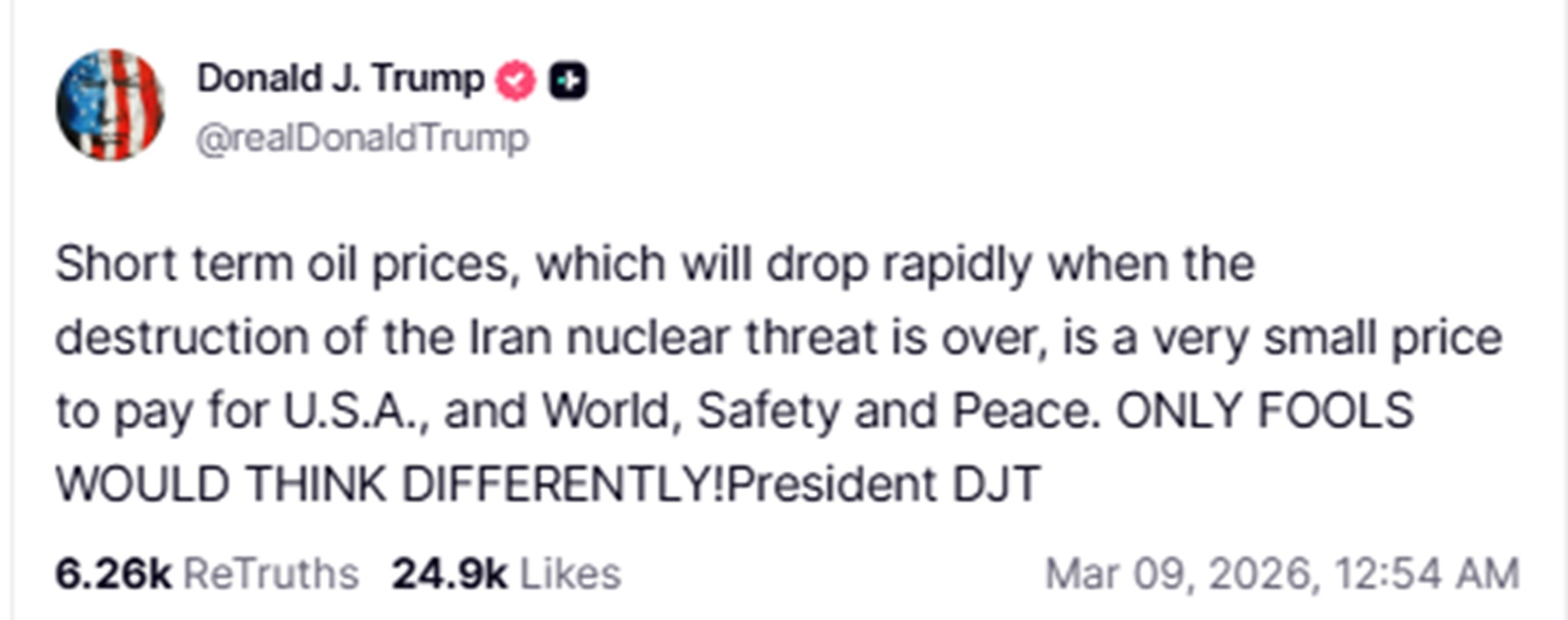 Η ραγδαία άνοδος των τιμών του πετρελαίου στις αγορές είναι «πολύ μικρό τίμημα για την ειρήνη και την ασφάλεια των ΗΠΑ και του κόσμου», υποστήριξε χθες Κυριακή ο αμερικανός πρόεδρος Ντόναλντ Τραμπ μέσω Truth Social, λίγη ώρα αφού το βαρέλι της αμερικανικής ποικιλίας WTI ξεπέρασε τα 100 δολάρια το βαρέλι στην αγορά εμπορευμάτων στο Σικάγο.