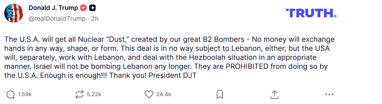 «Το Ισραήλ δεν θα βομβαρδίζει πλέον τον Λίβανο. Του έχει απαγορευτεί να το κάνει από τις ΗΠΑ. Αρκετά πια!!!». Αυτό δήλωσε με ανάρτησή του στο Truth Social ο Αμερικανός πρόεδρος, Ντόναλντ Τραμπ.