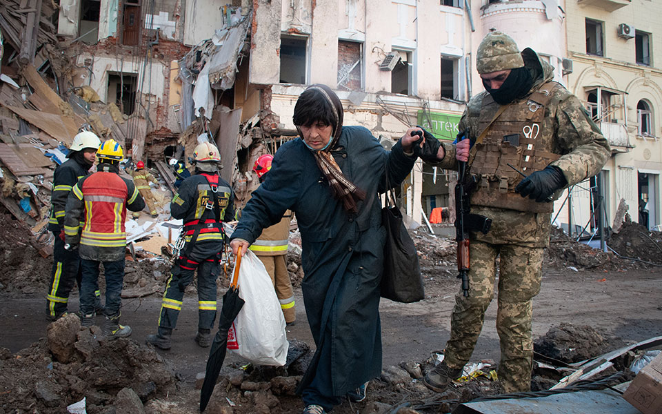 23:38 - Ένας εθελοντής των Ουκρανικών Δυνάμεων Εδαφικής Άμυνας βοηθά μια γυναίκα να διασχίσει τον δρόμο στο Χάρκοβο της Ουκρανίας