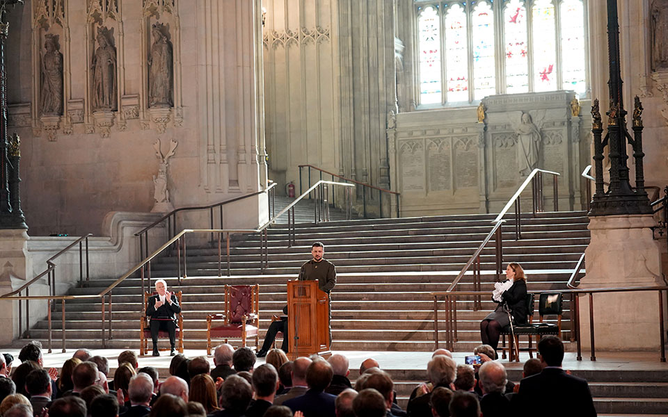 Βρετανοί βουλευτές και από τα δύο σώματα, των Κοινοτήτων και των Λόρδων, συγκεντρώθηκαν στην κεντρική αίθουσα του Κοινοβουλίου του Γουεστμίνστερ για να ακούσουν την ομιλία του Ουκρανού προέδρου Βολοντίμιρ Ζελένσκι, ο οποίος βρίσκεται από το πρωί στο Λονδίνο για επίσημη επίσκεψη.