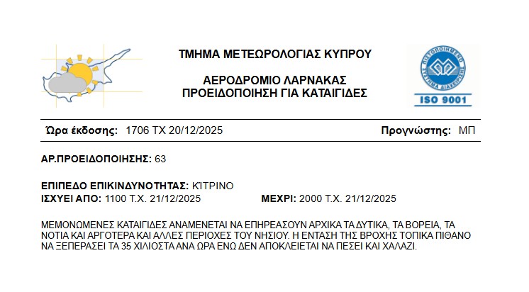 Σύμφωνα με σχετική ανακοίνωση, η προειδοποίηση ισχύει από τις 11.00πμ μέχρι τις 8.00μμ σήμερα και αφορά σε μεμονωμένες καταιγίδες, οι οποίες αναμένεται να επηρεάσουν αρχικά τα δυτικά, τα βόρεια, τα νότια και αργότερα και άλλες περιοχές του νησιού.
