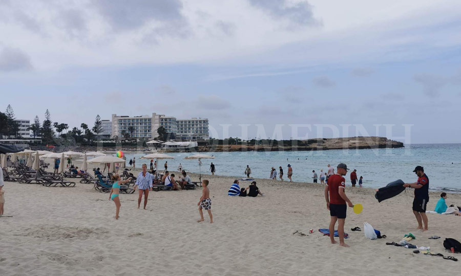 Όπως βλέπετε στις εικόνες που εξασφαλίσαμε, στην παραλία Nissi Beach αρκετός κόσμος απολαμβάνει τη θάλασσα και τα παιχνίδια στην άμμο.