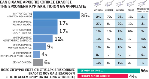 Η έρευνα της Symmetron Market Research που δημοσιεύτηκε στην «Κ» στις 11 Δεκεμβρίου, όπως φαίνεται και στην κάρτα έδειχνε τον Μητροπολίτη Λεμεσού πρώτο, στην δεύτερη θέση τους Μητροπολίτης Πάφου και Ταμασού να ισοψηφούν. Στην τέταρτη θέση ήταν ο Μητροπολίτης Κωνσταντίας, στην πέμπτη θέση ο Μητροπολίτης Μόρφου και έκτος ο Μητροπολίτης Κυρηνείας. Το εκπληκτικό με τη συγκεκριμένη δημοσκόπηση δεν είναι η σειρά κατάταξης αλλά τα ποσοστά που έδινε στους έξι υποψηφίους.
