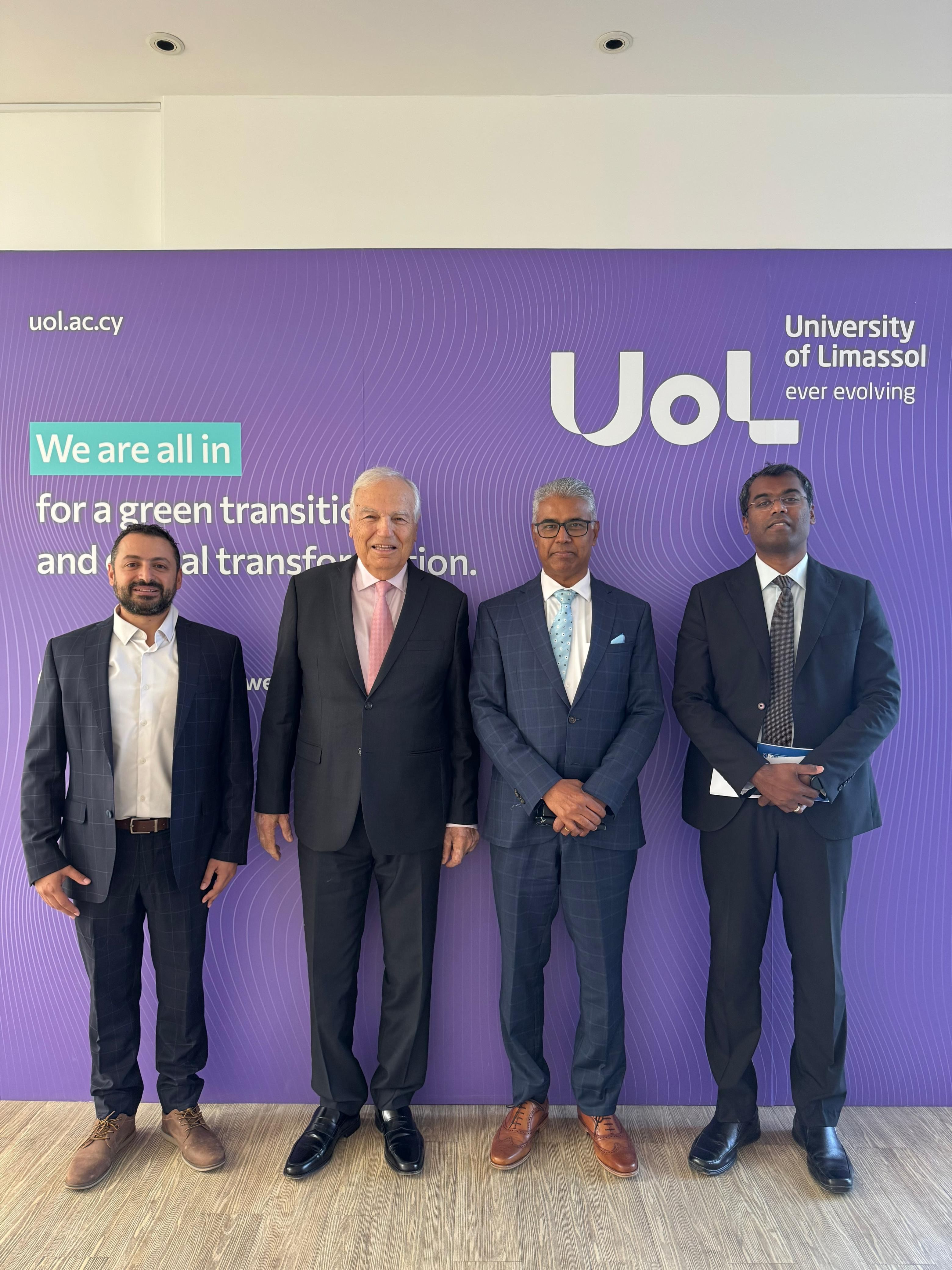 Το Πανεπιστήμιο Λεμεσού (University of Limassol – UoL) υποδέχθηκε με ιδιαίτερη τιμή, στις 12 Νοεμβρίου 2025, στη Λευκωσία, τον Εξοχότατο κ. Manish, Ύπατο Αρμοστή της Ινδίας στην Κυπριακή Δημοκρατία, στο πλαίσιο της πρώτης επίσημης επίσκεψής του στο Πανεπιστήμιο.
