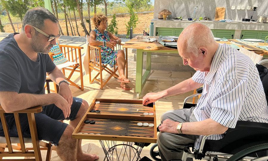 Ο Γιώργος Βασιλείου με τον γιο του Ευέλθων Βασιλείου παίζουν τάβλι στο εξοχικό της κόρης του Βάσως στον Κάθηκα.