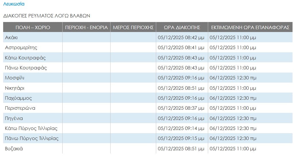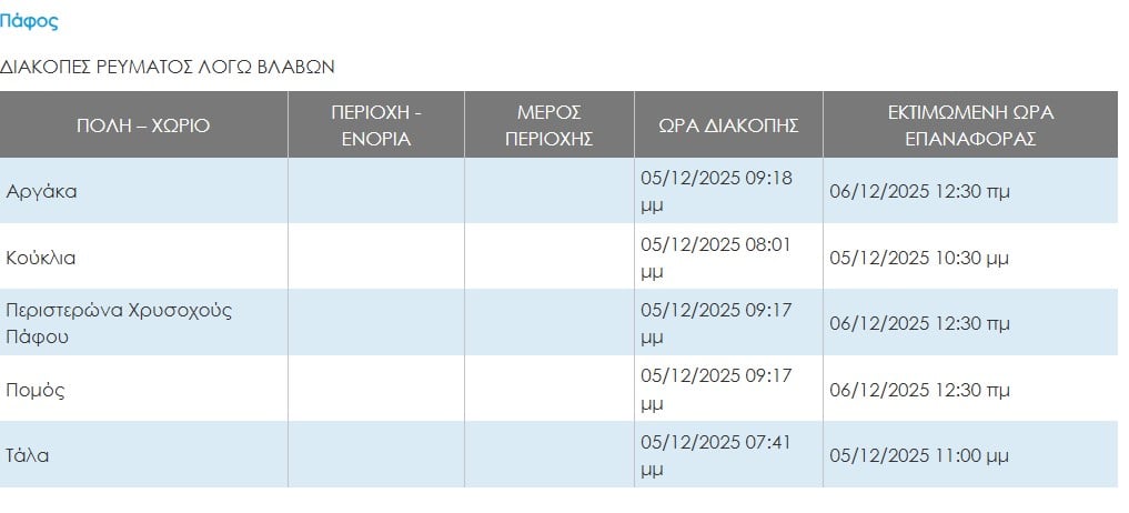 Διακοπές ρεύματος σημειώθηκαν σε διάφορες περιοχές της Κύπρου, συγκεκριμένα στις επαρχίες Λεμεσού, Λευκωσίας και Πάφου, σύμφωνα με την ΑΗΚ.