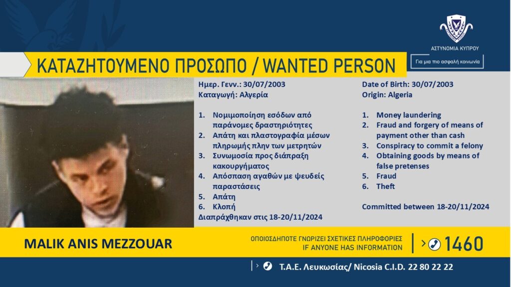 Η Αστυνομία ζητά πληροφορίες που μπορούν να βοηθήσουν στον εντοπισμό του Malik Anis Mezzouar, 21 ετών, από την Αλγερία, ο οποίος καταζητείται για διευκόλυνση των ανακρίσεων, σχετικά με διερευνώμενη υπόθεση νομιμοποίησης εσόδων από παράνομες δραστηριότητες, κλοπής, απάτης, πλαστογραφίας και απόσπασης αγαθών με ψευδείς παραστάσεις, αδικήματα τα οποία σύμφωνα με τα υπό διερεύνηση στοιχεία, διαπράχθηκαν μεταξύ των ημερομηνιών 18-20 Νοεμβρίου, 2024, στη Λευκωσία.