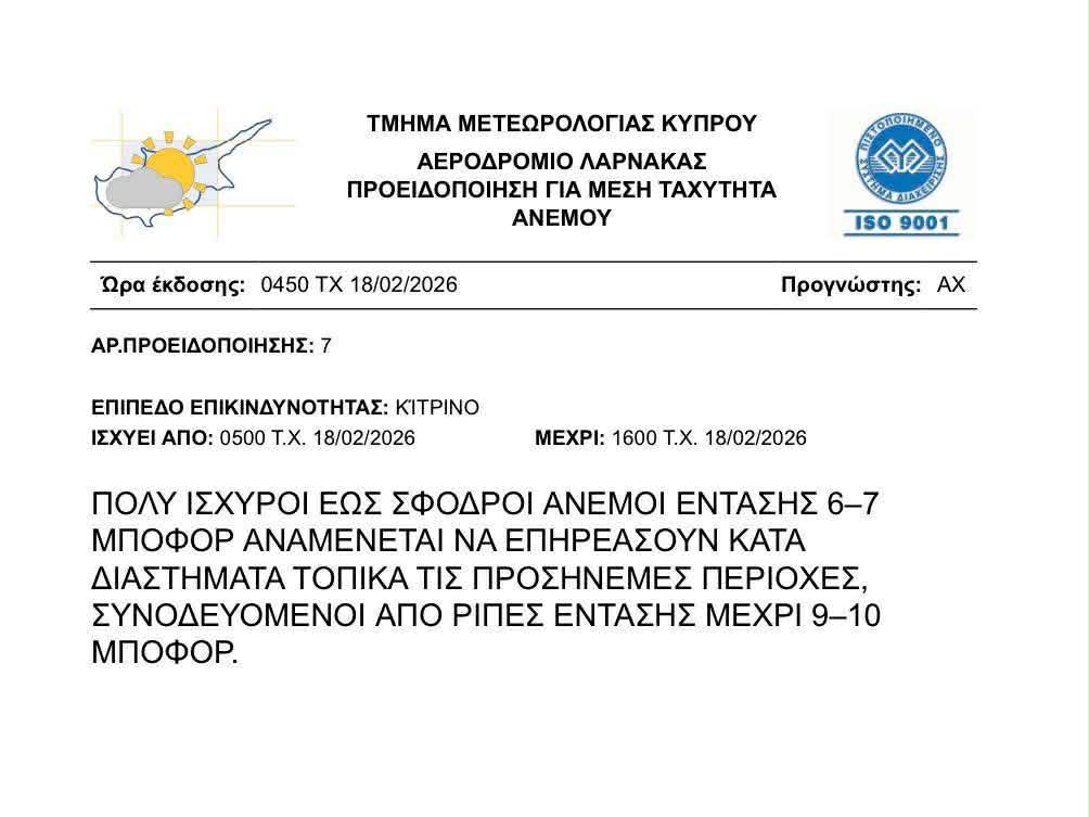 Στο μεταξύ, η Μετεωρολογική Υπηρεσία εξέδωσε κίτρινη προειδοποίηση για πολύ ισχυρούς έως σφοδρούς άνεμους έντασης 6-7 μποφόρ συνοδευόμενοι από ριπές έντασης μέχρι 9 - 10 μποφόρ.