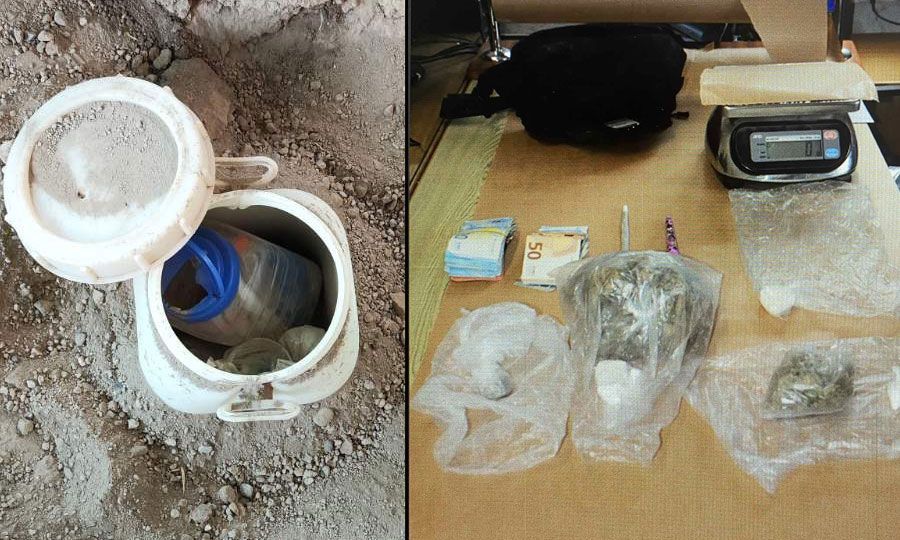Ακολούθως, έγινε έρευνα στο περιβόλι, δυνάμει δικαστικού εντάλματος, όπου εντοπίστηκαν και κατασχέθηκαν, ένα θαμμένο πλαστικό βαρέλι που περιείχε 594 γραμμάρια κάνναβης, 50 γραμμάρια κοκαΐνης και μία ζυγαριά με ίχνη κάνναβης.