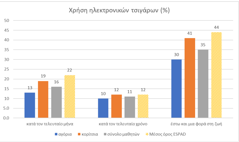 Εκεί που φαίνεται η Κύπρος να ξεπερνά τον μέσο όρο της έρευνας είναι στην καθημερινή χρήση του ηλεκτρονικού τσιγάρου. Από την άλλη, παρατηρείται σταθεροποίηση στα χαμηλά επίπεδα καπνίσματος συμβατικού τσιγάρου. Μάλιστα, το ποσοστό των μαθητών που ανέφεραν κάπνισμα κατά τις τελευταίες 30 μέρες εξακολουθεί να βρίσκεται κάτω από τον μέσο όρο της ESPAD.
