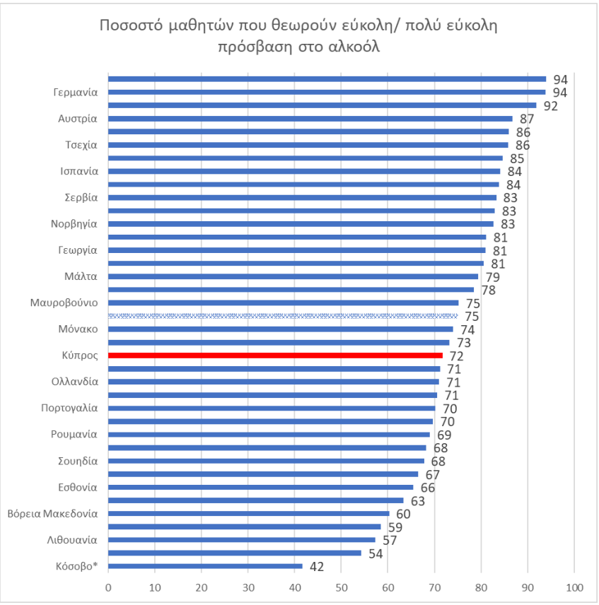 Σε μεγάλη εικόνα, παρατηρείται μείωση στην κατανάλωση αλκοόλ, παρόλα αυτά, το ποσοστό αυτό εξακολουθεί να υπερβαίνει τον μέσο όρο της έρευνας, κατά περίπου 2%, με τον μέσο όρο να ανέρχεται στο 42% του συνόλου των μαθητών. Ωστόσο, η αντιλαμβανόμενη διαθεσιμότητα του αλκοόλ (ποσοστό μαθητών που θεωρεί εύκολο ή πολύ εύκολο να βρουν αλκοόλ), βρίσκεται σε μεσαία επίπεδα σε σχέση με άλλες χώρες και βρίσκεται κάτω από τον μέσο όρο της έρευνας.