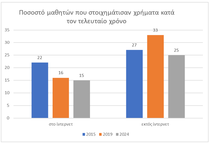 Σε ότι αφορά τον στοιχηματισμό, οι μαθητές στην Κύπρο φαίνεται να στοιχηματίζουν χρήματα, όσο και οι υπόλοιποι ευρωπαίοι μαθητές. Επίσης, τα ποσοστά στοιχηματισμού ανάμεσα στους μαθητές στην Κύπρο είναι αρκετά ψηλότερα εκτός διαδικτύου (25%, σε σχέση με 15% στο διαδίκτυο). Ωστόσο, σε σχέση με την προηγούμενη σειρά της έρευνας, φαίνεται ότι έχει μειωθεί το ποσοστό των μαθητών που στοιχηματίζουν χρήματα εκτός διαδικτύου.