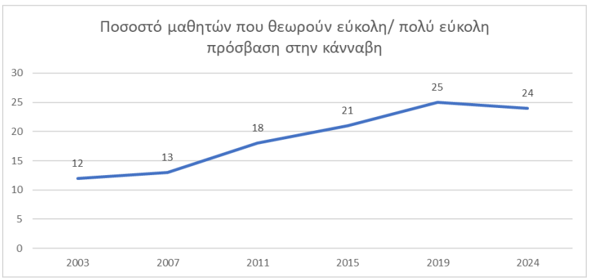 Σε ότι αφορά την αντιλαμβανόμενη διαθεσιμότητα της κάνναβης, διαχρονικά φαίνεται μια αύξηση στο ποσοστό των μαθητών της Κύπρου που θεωρεί ότι είναι εύκολο ή πολύ εύκολο να βρουν την κάνναβη εάν το θελήσουν.