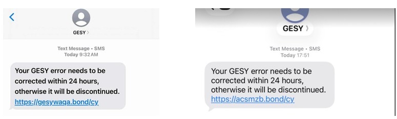 Τα μηνύματα αυτά ενημερώνουν παραπλανητικά τον παραλήπτη ότι πρέπει να ακολουθήσει συγκεκριμένο ηλεκτρονικό σύνδεσμο με σκοπό τη διόρθωση προσωπικών του στοιχείων όπως φαίνεται στα παραδείγματα πιο κάτω: