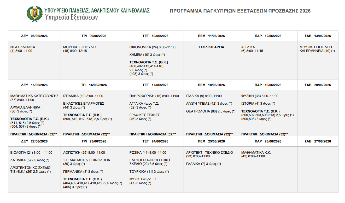 Στις 8 Ιουνίου αρχίζουν οι Παγκύπριες Εξετάσεις Πρόσβασης για το 2026. Οι ενδιαφερόμενοι θα πρέπει να υποβάλουν τις αιτήσεις τους από τις 2 Μαρτίου μέχρι τις 14 Μαρτίου.