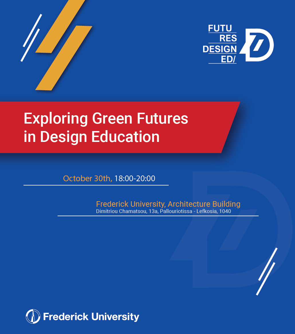 Το Πανεπιστήμιο Frederick πραγματοποιεί εκδήλωση με τίτλο “Exploring green futures in design education”, στην οποία περιλαμβάνονται ομιλίες, παρουσιάσεις και εργαστήρια που διερευνούν πώς η τέχνη, ο σχεδιασμός και η καινοτομία μπορούν να συμβάλουν σε ένα πιο βιώσιμο μέλλον. Η εκδήλωση θα πραγματοποιηθεί την Πέμπτη 30 Οκτωβρίου στις 18:00-20:00 στο Κτήριο του Τμήματος Αρχιτεκτόνων Μηχανικών του Πανεπιστημίου Frederick, στη Λευκωσία.