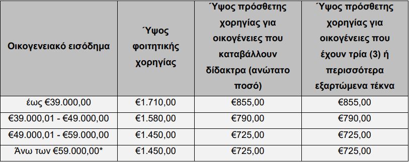 Δικαίωμα σε φοιτητική χορηγία έχει η οικογένεια φοιτητή/τρια της οποίας το ετήσιο ακαθάριστο οικογενειακό εισόδημα του έτους 2023, δεν υπερβαίνει τις €59.000 όταν αυτή έχει μέχρι και δύο εξαρτώμενα τέκνα. Για τις οικογένειες με περισσότερα από δύο εξαρτώμενα τέκνα, το ετήσιο ακαθάριστο οικογενειακό εισόδημα μπορεί να υπερβεί τις €59.000 κατά €5.000 για κάθε πρόσθετο τέκνο.