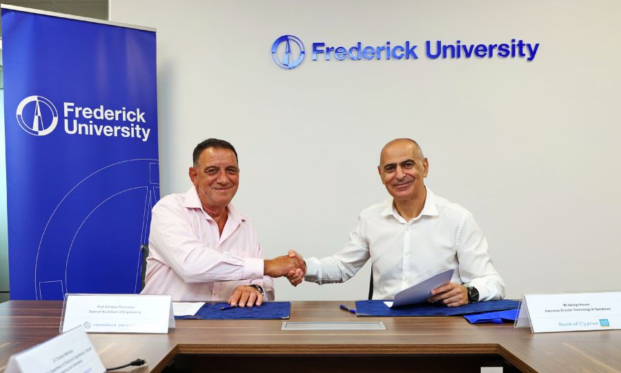 Το Μνημόνιο υπογράφηκε από τον κ. Γιώργο Κουσή, Executive Director Technology & Operations της Τράπεζας Κύπρου, και από τον Καθηγητή Χρίστο Θεμιστό, Κοσμήτορα της Πολυτεχνικής Σχολής του Πανεπιστημίου Frederick.