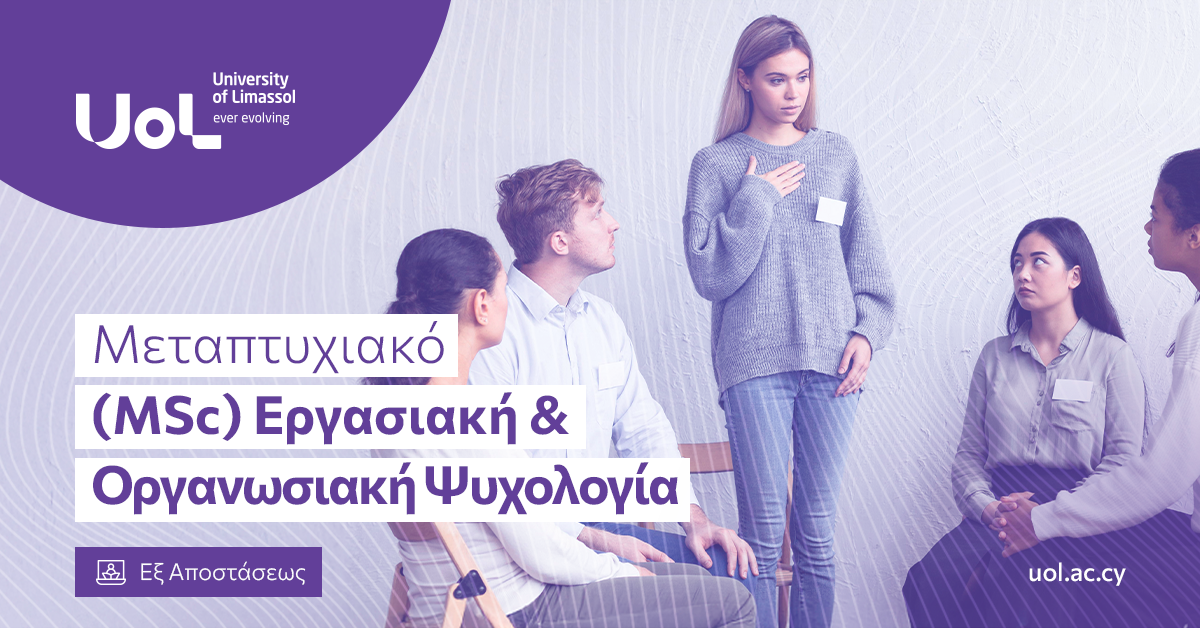 Το Πανεπιστήμιο Λεμεσού (UoL) ανακοινώνει την έναρξη εγγραφών για το μεταπτυχιακό πρόγραμμα MSc Εργασιακή & Οργανωσιακή Ψυχολογία (εξ αποστάσεως, γλώσσα: ελληνικά). Το πρόγραμμα εστιάζει στην εφαρμογή επιστημονικά τεκμηριωμένων ψυχολογικών αρχών για την ευημερία των εργαζομένων, τη βελτίωση της απόδοσης και τη συνολική οργανωσιακή αποτελεσματικότητα.