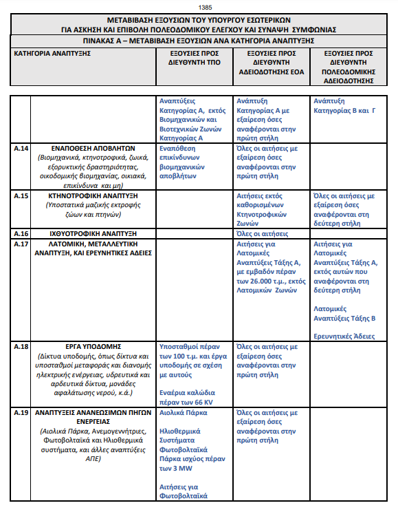 Σύμφωνα με τους πίνακες, στον διευθυντή του Τμήματος Πολειοδομίας και Οικήσεως παραμένουν, μεταξύ άλλων, όλες οι αιτήσεις για αναπτύξεις για τις οποίες η Κυπριακή Δημοκρατία έχει δεσμευθεί με συμβατικές υποχρεώσεις με άλλα κράτη (πρεσβείες, κ.α.), αναπτύξεις που αφορούν της Εθνική Ασφάλεια, την Εθνική Οικονομία (αεροδρόμια, μαρίνες, λιμάνια, καζίνο, γήπεδα γκολφ, αγκυροβόλια, συνεδριακά κέντρα κ.α.), ενοποιημένες αναπτύξεις μεγάλων και σύνθετων χρήσεων, εξειδικευμένες αναπτύξεις, ιδιωτικά νοσηλευτήρια με βάση τον περί Ιδιωτικών Νοσηλευτηρίων Νόμο, Κέντρα έρευνας και ανάπτυξης, αναπτύξεις υψηλής τεχνολογίας, σχολές τριτοβάθμιας εκπαίδευσης, σχολεία πρωτοβάθμιας και δευτεροβάθμιας εκπαίδευσης, στάδια και γήπεδα με αριθμό θεατών μεγαλύτερο των 2.000, ενιαία τουριστικά συγκροτήματα εκτός ορίου ανάπτυξης, τουριστική ανάπτυξη πέραν των 500 κλινών Επισκέψιμα Αγροκτήματα (ως ορίζονται στα Σχέδια Ανάπτυξης), κατασκηνώσεις πολυτελείας, αιτήσεις για βιομηχανικές, βιοτεχνικές και αποθηκευτικές.