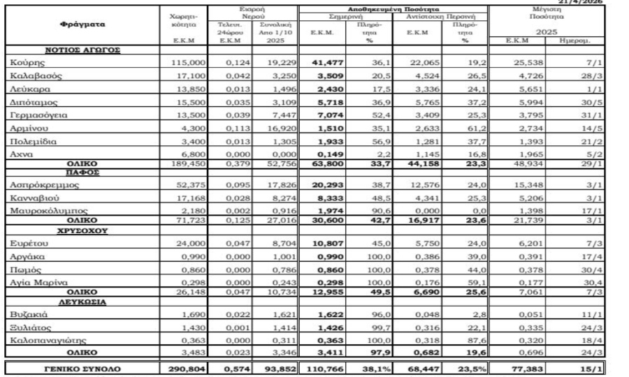 Σύμφωνα με τα δεδομένα που καταγράφει το Τμήμα Αναπτύξεως Υδάτων, από τα τέλη Μαρτίου, τα φράγματα Αργάκας, Πωμού, Αγία Μαρίνα, και Καλαπαναγιώτη έφτασαν το 100% της πληρότητας τους. Το φράγμα Ξυλιάτου βρίσκεται στο 99,7% της πληρότητάς του.